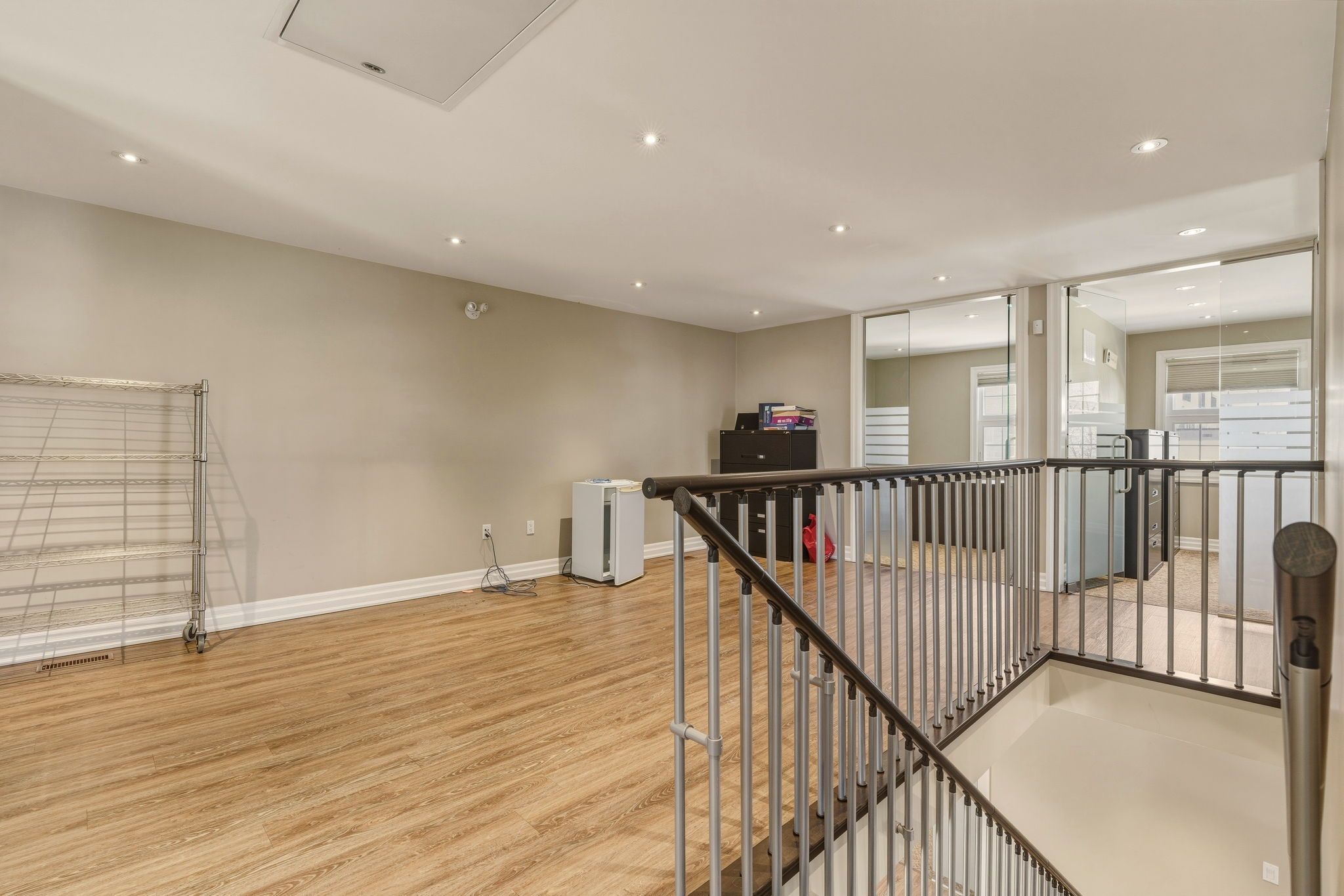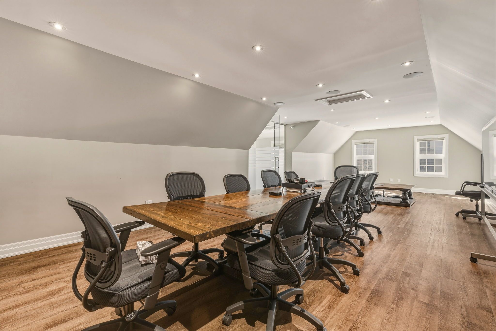 Fridge, Window coverings, Electric Light Fixtures, Industrial humidifier . Large room in upper front office T.V, centre table, chairs, whiteboard and coffee table.